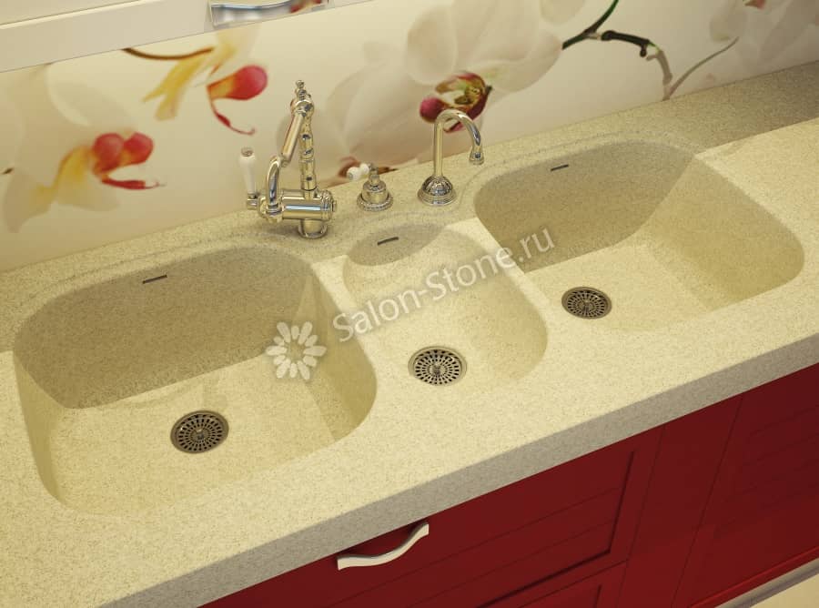 Мойка Staron с тремя секциями может стать настоящим рабочим центром кухни. Конструкция имеет две большие раковины и одну маленькую, расположенную между ними. Изделие станет отличным вариантом для тех, у кого в семье готовят одновременно несколько человек. Один может чистить овощи, другой – мыть посуду, а в третьей раковине гости или дети смогут помыть руки или набрать стакан воды, при этом никто никому не будет мешать. Изделие отлично впишется в просторное помещение, а гигиеничность материала обеспечит антибактериальные свойства – поверхность не будет впитывать грязь и выделять вредных веществ.